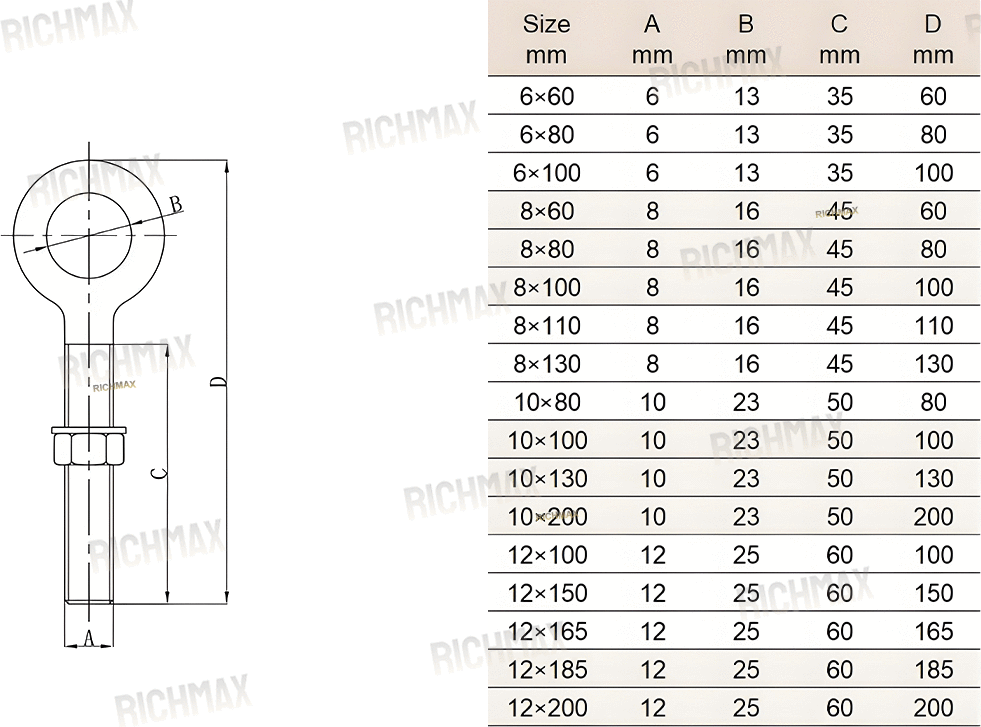 Stainless Steel Long Shank Eye Bolt With Washer & Nut