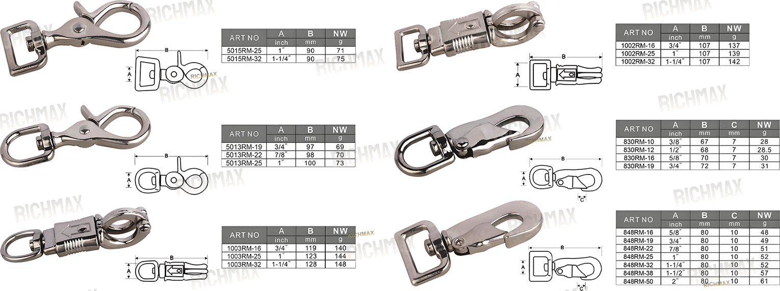 Type: Swiveling round eye panic snap, Swivel Trigger snap, Swiveling strap cap snap hook