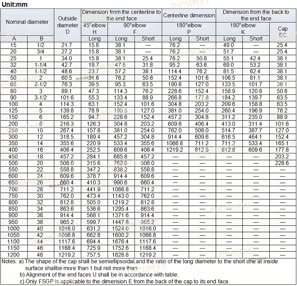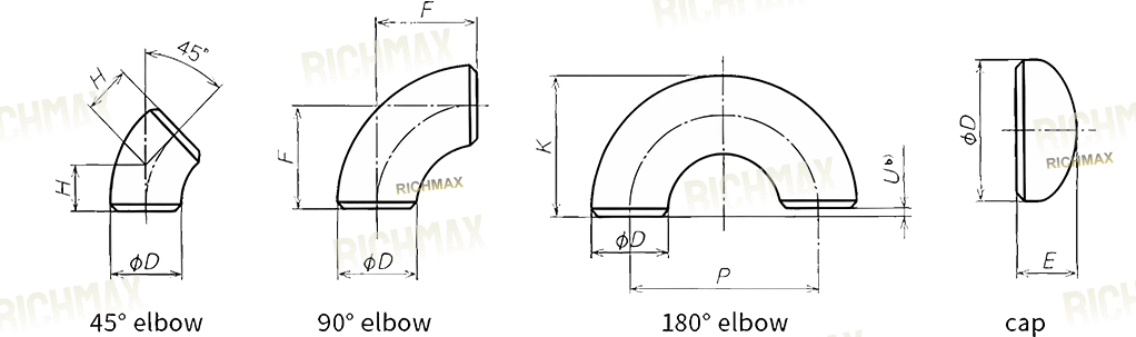 Type: Shapes of 45° elbows, 90° elbows, 180° elbows and caps