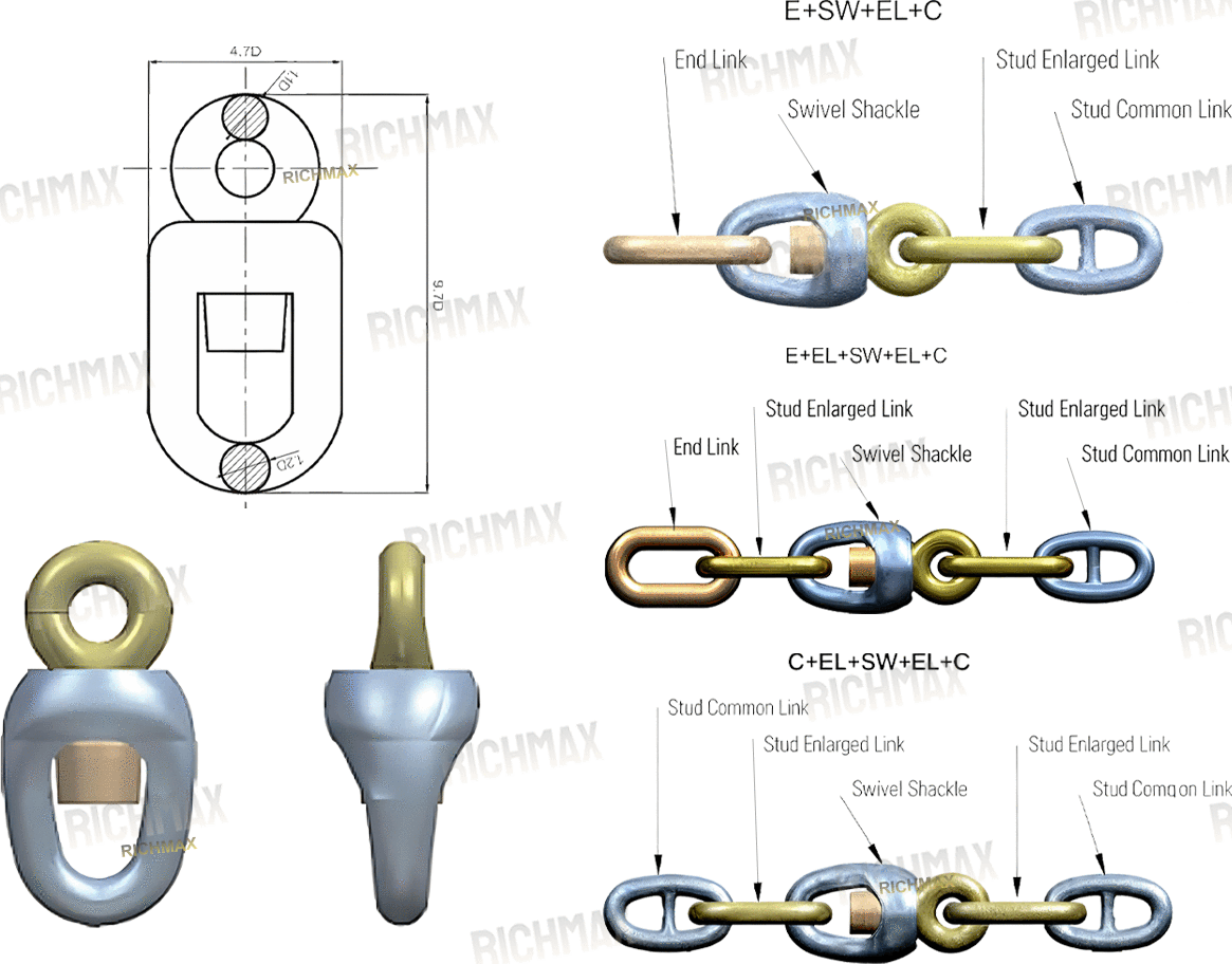 The precision swivel design minimizes chain twisting, enhancing operational safety and reducing wear on connected components.