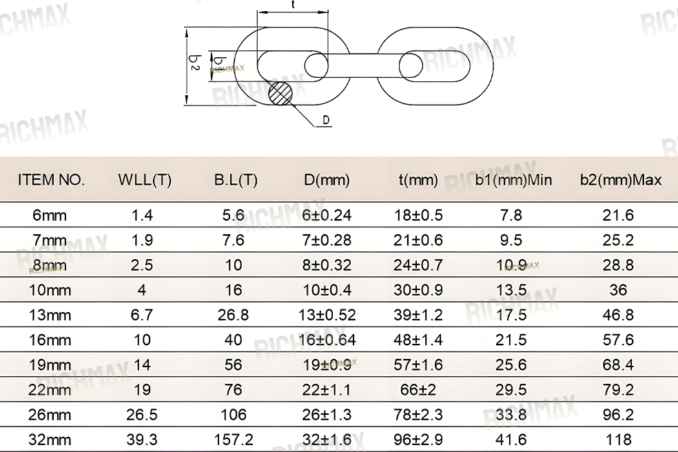 The chain meets or exceeds EN818-2 mechanical performance requirements, ensuring consistent strength, elongation control, and load reliability across all segments.