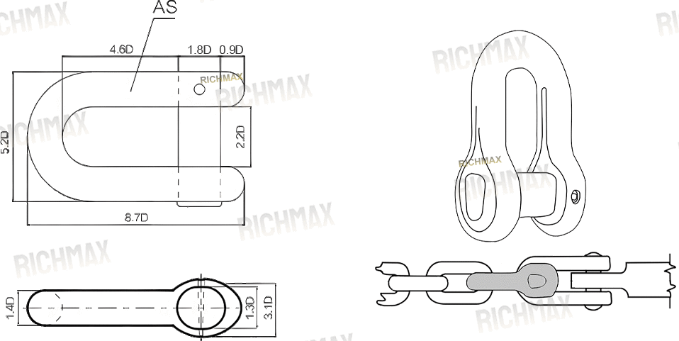 Application: Connects anchor chain to swivel, kenter shackle, forerunner, or anchor