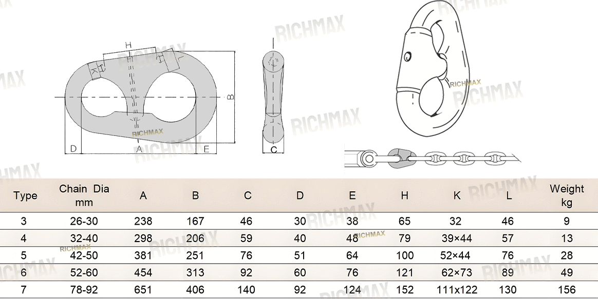 Application: Connects chains to swivels, kenter shackles, anchors, or forerunners