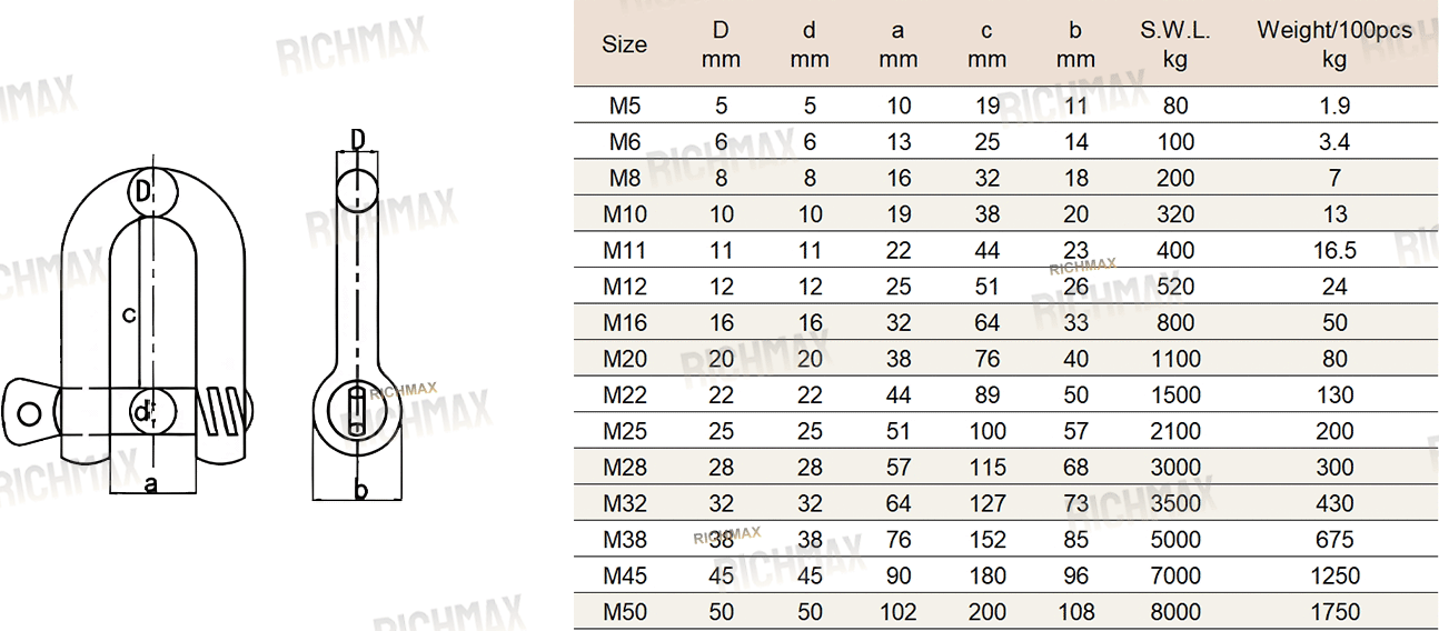Unlike bow shackles, the dee shackle features a narrow “D” shape ideal for straight-line load applications, shipyard lifting, construction rigging, truck towing, connecting lifting slings, chains, or hooks.