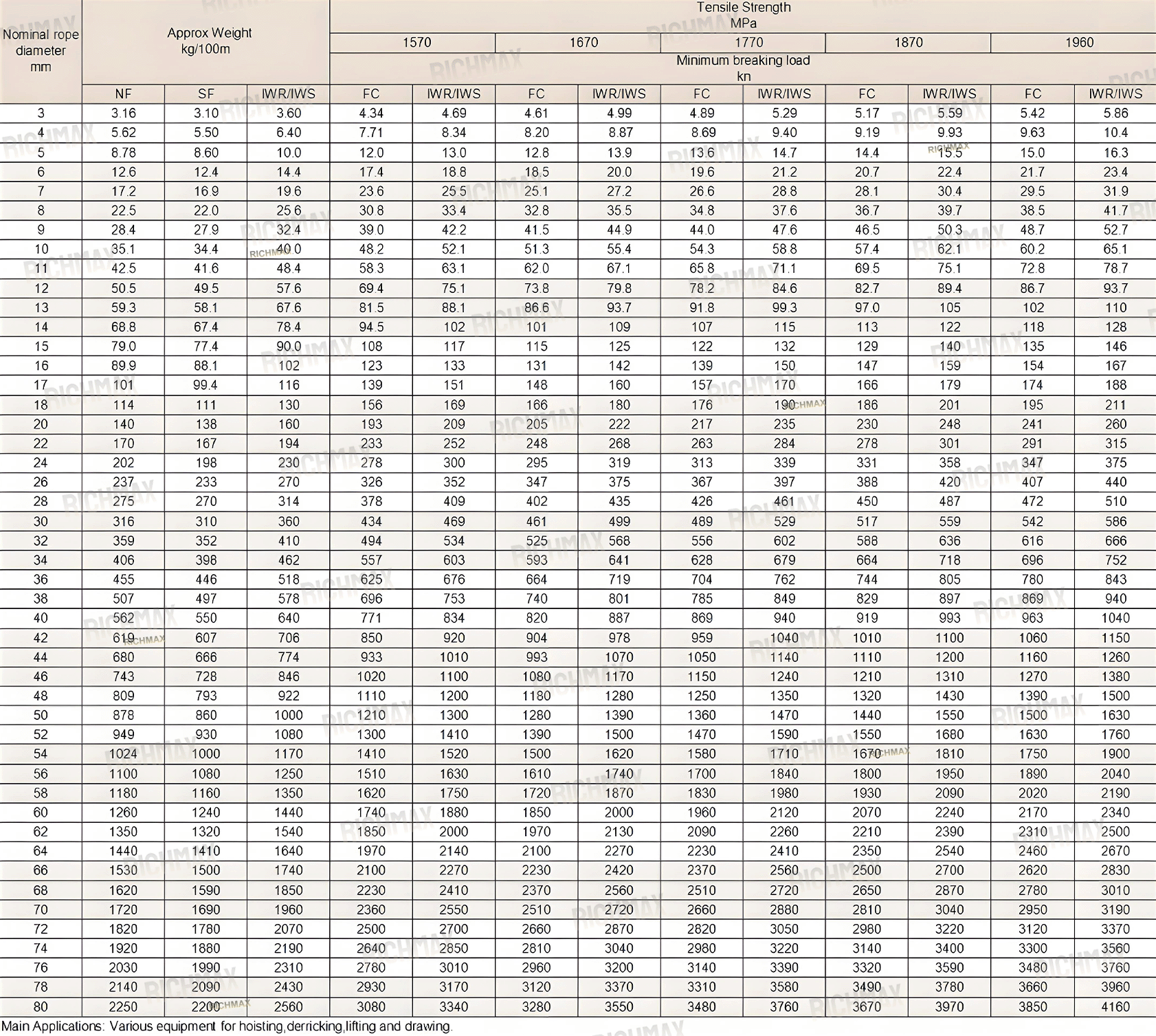 Type of cores: Natural Fiber Core(NFC/NF), Synthetic fiber core(SFC/SF), Independent Wire Strand(IWS), Independent Wire Rope(IWR)