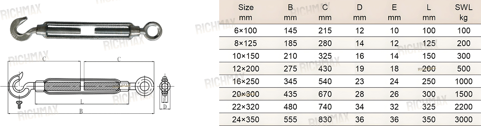 This Turnbuckle Commercial Type with Hook/Eye is designed for everyday utility where frequent tensioning is required. Made from malleable iron, it resists cracking under moderate loads and is zinc-coated for better corrosion protection.