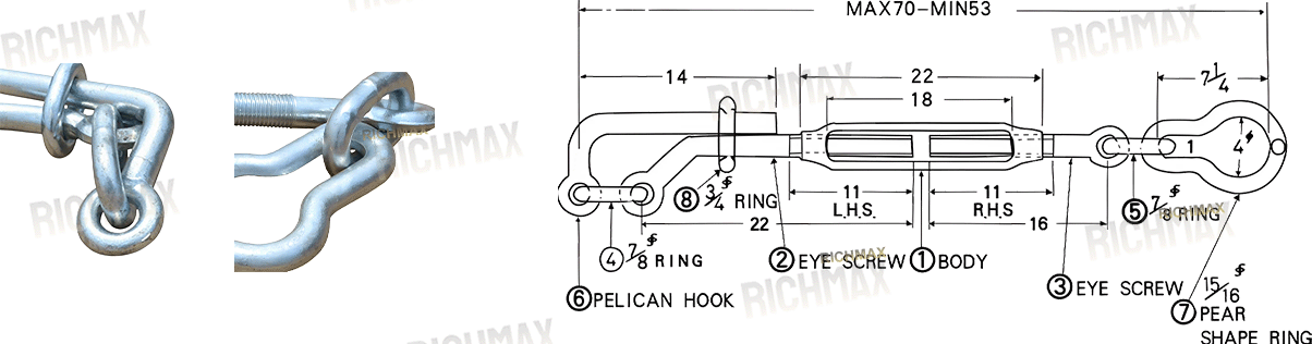 It can be used as a connecting device with cable or chain on deck. And it also can takes up slack by rotating on its screw threads.