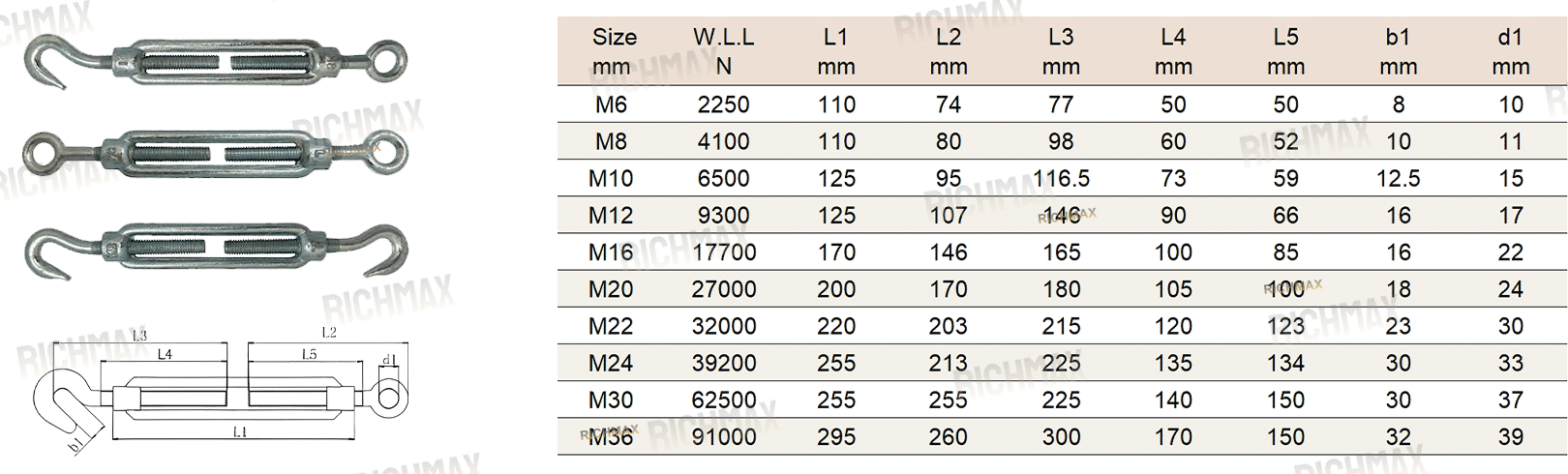 End fittings: Hook/Eye, Eye/Eye, Hook/Hook