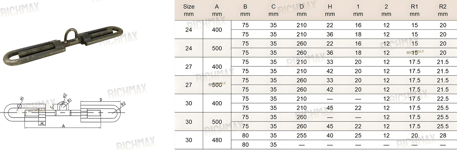 The Hamburger Lashing Turnbuckle is a specialized rigging component used to secure heavy cargo on ship decks and containers.