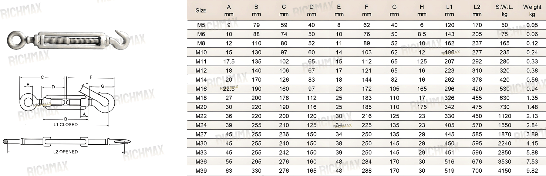 The hook and eye ends provide quick assembly and secure fit for wire ropes or chains.